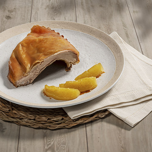 Peça de garrí condimentada amb sal, pebre i oli d’oliva i cuinada a baixa temperatura durant més de 12 hores per aconseguir una textura de carn tendra i melosa, que una vegada regenerada al forn combinarà amb la textura cruixent de la seva pell, obtenint un plat tradicional i deliciós, fàcil de preparar. S’acompanya de pomes confitades, que aportaran una guarnició ideal al plat amb un toc dolç al paladar.